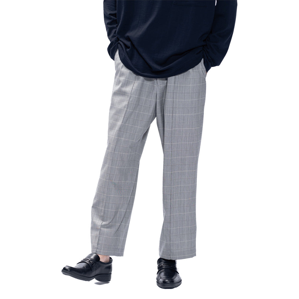 ジャケットとの調和を考え、パンツも適度なゆとりを持たせたオーバーサイズのシルエットにしました。